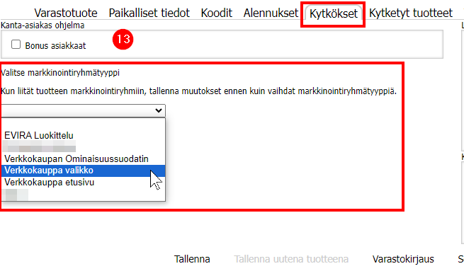 Tuote tulee lisätä markkinointiryhmään Kytkökset välilehdeltä.