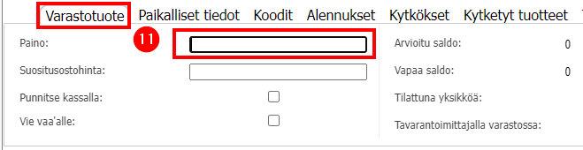 Tuotteen paino kannattaa asettaa Varastotuote (11) välilehdeltä. Tätä tietoa käytetään toimitustapojen skaalaamisessa painon perusteella.